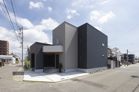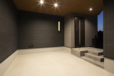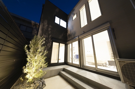 ・車の乗降時に雨を避けられるインナーガレージや、グレー・ブラック・木目系を取り入れたスタイリッシュな外観を意識しました。四角い建物が組み合わさったどっしりとした雰囲気も気に入っています。色の打ち合わせでは、センス良くデザインしていただき満足しています。外壁やシンボルツリーのライトアップも昼間とは異なる雰囲気で気に入っています。