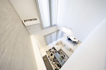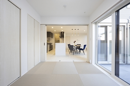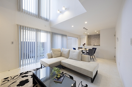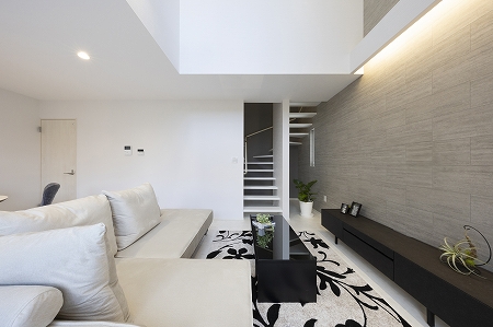 ・全体的にとても満足しています。内装はホワイトをベースに、洗練された空間を意識しました。生活の中心になるLDKは、できるだけ広く感じられるように吹き抜けを設けて、プライベートな中庭が眺められるように配置しました。踏み板のみの階段は抜け感を出しつつ、リビングのアクセントにもなっていてお気に入りです。2方向から出入りできる玄関は、常にお客様用をきれいに保てるのでとても助かります。最も気に入っているのはリビング吹抜けです。吹抜けがあると開放感抜群で雰囲気が良いです。西側にほとんど窓を設けなかったことや、サッシ性能の高さもあってか、夏場でも暑さをあまり感じません。幹太くんは洗濯物の乾きが早くふんわり仕上がりで便利です。パントリーは同じ大きさのトレーを入れて分類しており、物が取り出しやすく便利です。